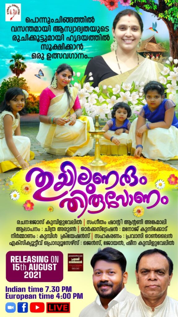 ബര്ലിന്: 1988 മുതല് ക്രിസ്തീയ ഭക്തിഗാന ശാഖയില് തനതായ വ്യക്തിമുദ്രപതിപ്പിച്ച കുമ്പിള് ക്രിയേഷന്സിന്റെ ബാനറില് യൂറോപ്പിലെ ആദ്യത്തെ (2007) മലയാളത്തിലുള്ള ന്യൂസ്പോര്ട്ടലായ പ്രവാസി ഓണ്ലൈനിന്റെ സഹകരണത്തോടെ ഓണത്തെ സംഗീതമയമാക്കാന് ഒരുക്കിയ പ്രഥമ ഉല്സവ ഗാനമായ “തുയിലുണരും തിരുവോണം”എന്ന തിരുവോണ ആല്ബം ഇന്ഡ്യന് സ്വാതന്ത്ര്യത്തിന്റെ 75ാം വാര്ഷിക ദിനമായ ഓഗസ്ററ് 15 ന് ഞായറാഴ്ച റിലീസ് ചെയ്യും. ഗാനത്തിന്റെ വരികള് രചിച്ചത് ജോസ് കുമ്പിളുവേലിയും സംഗീതം പകര്ന്നത് പുതിയ കാലഘട്ടത്തില് ഏറെ ശ്രദ്ധേയനായ യുവസംഗീത സംവിധായകന് ഷാന്റി ആന്റണി […]